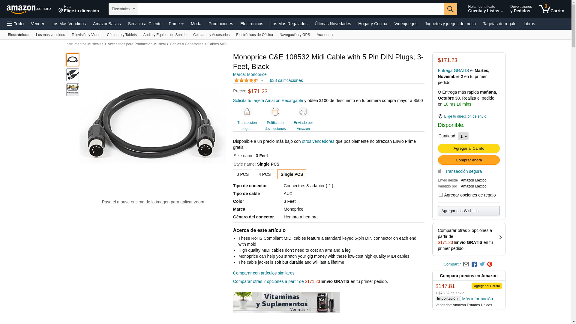 Monoprice MIDI Cable with 5 Pin DIN Plugs, 3-Feet, Black (108532) (2 Pack)