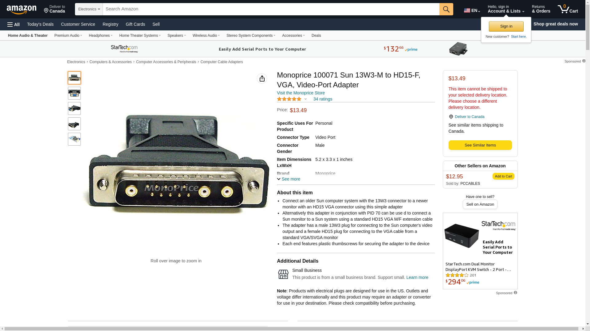 Monoprice 100071 Sun 13W3-M to HD15-F, VGA, Video-Port Adapter. Connect an older Sun computer system with the 13W3 co...