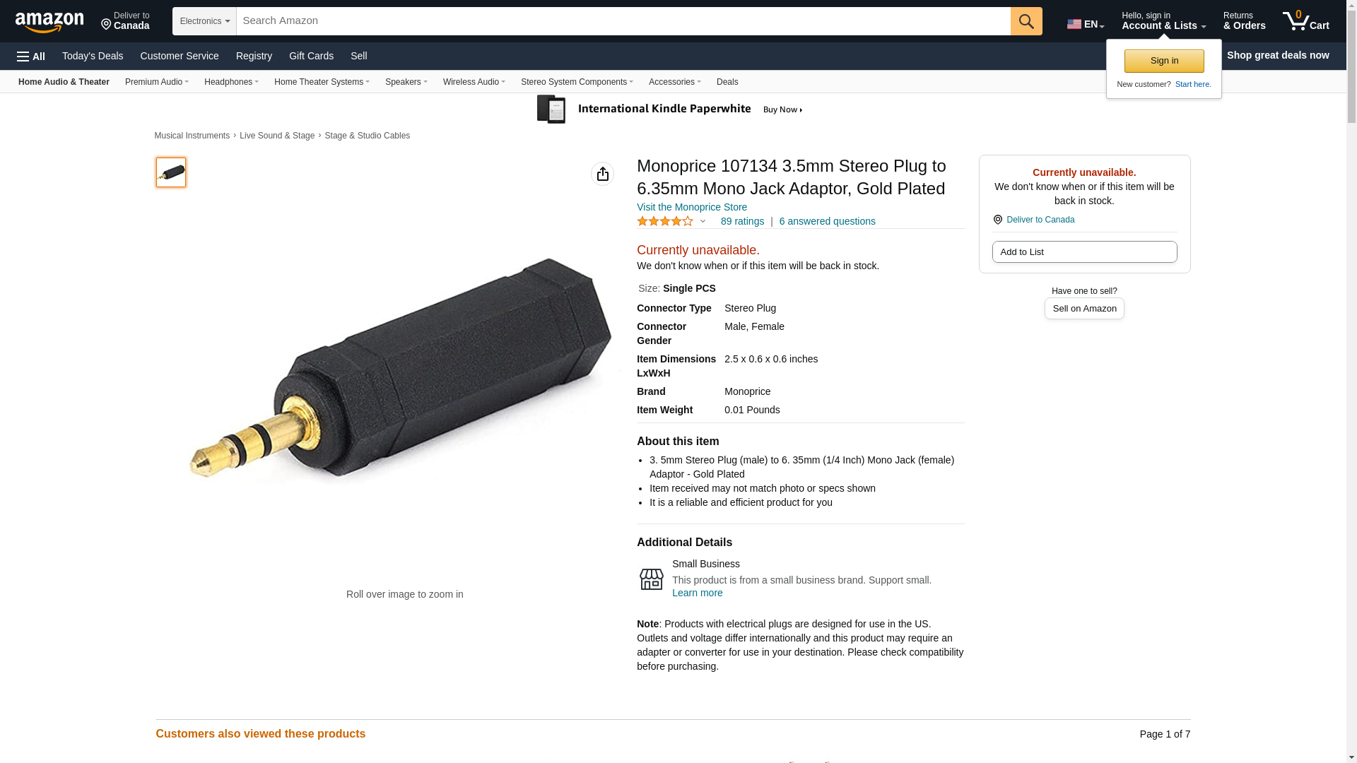 - 3. 5mm Stereo Plug (male) to 6. 35mm (1/4 Inch) Mono Jack (female) Adaptor - Gold Plated
