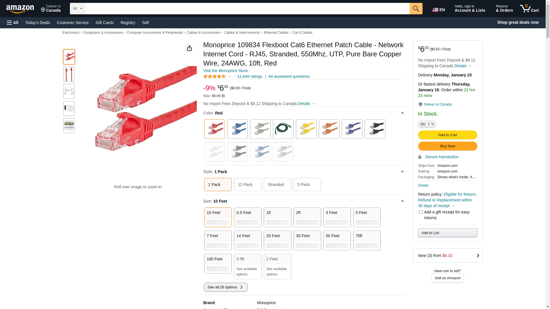 Monoprice Cat6 Ethernet Patch Cable - RJ45, Stranded, 550Mhz, UTP, Pure Bare Copper Wire, 24AWG, 10 Feet, Red - Flexboot Series