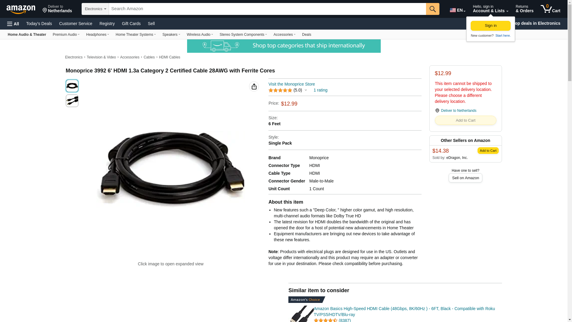 Monoprice 3992 6' HDMI 1.3a Category 2 Certified Cable 28AWG with Ferrite Cores
