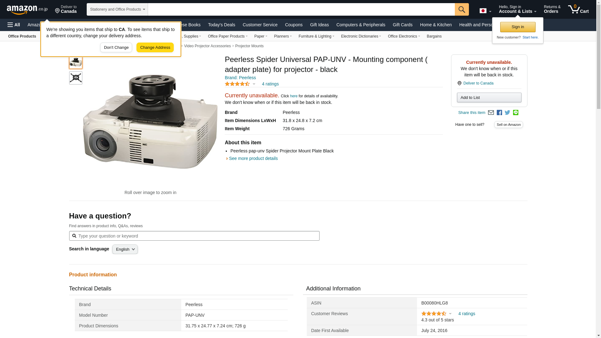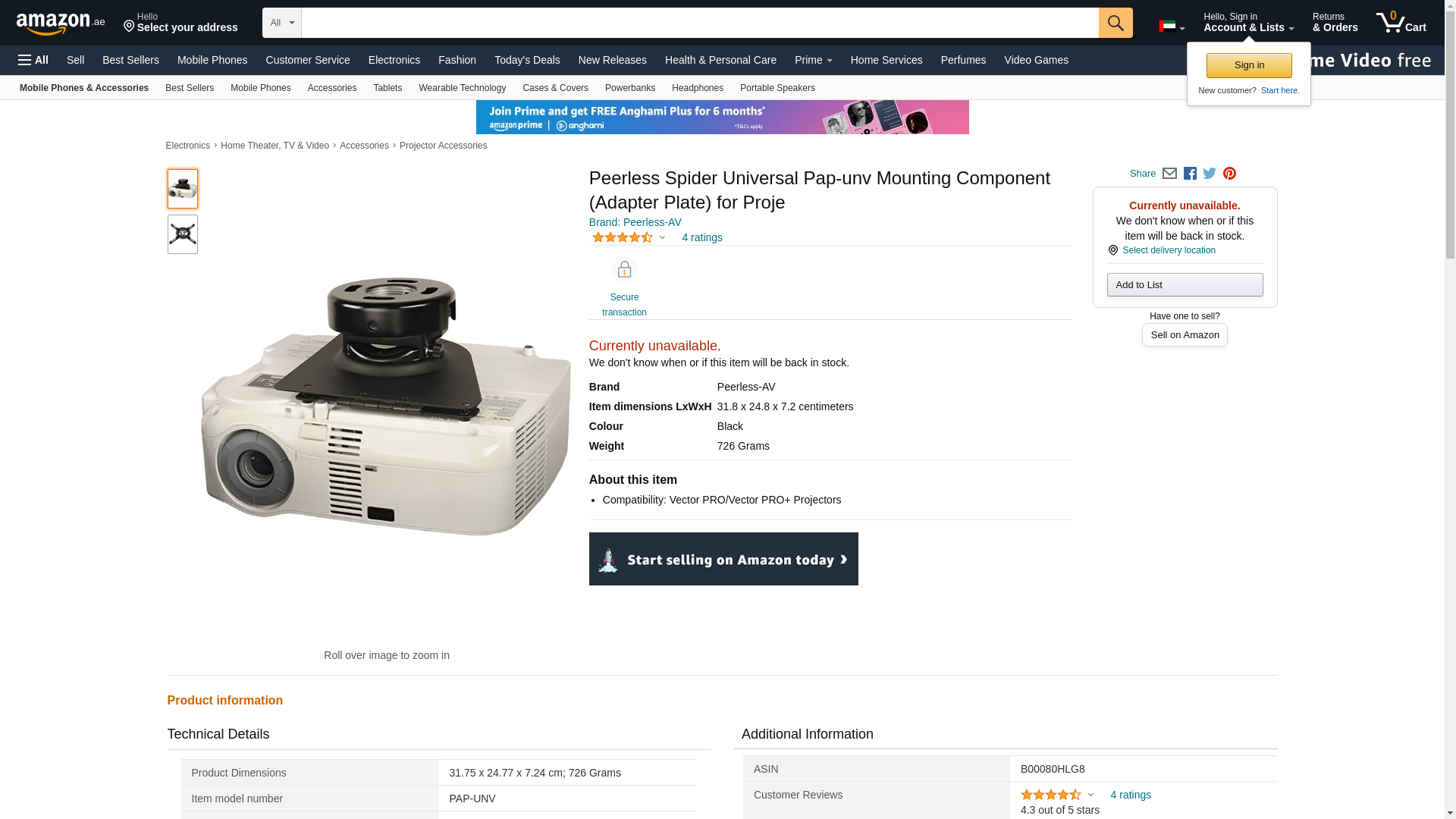Peerless-AV, Pap-UNV, Projector Adapter Plate, Black, Does not Include Mounting Block