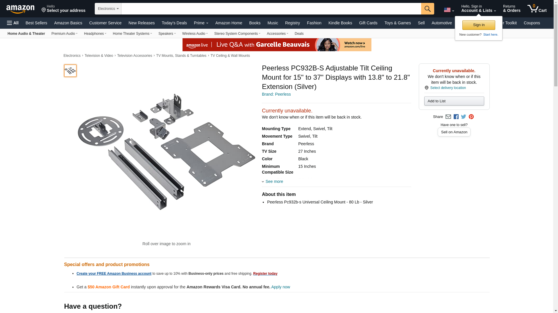 Peerless PC932 No wall space? No problem. The ceiling is a great place to mount a flat panel when there is no wall available. Ceiling installation is made simple with PC932s one-two-three design. Simply attach the ceiling plate, attach the adapter to the screen and hook-on the TV on to the mount Done. This VESA compliant LCD mount delivers the ultimate in positioning options with its tilt and infinite swivel to achieve an ideal flat panel viewing experience. Features: -VESA 75, 100, 200x100, and 200x200 compatible (most 15" to 37" screens) -+15°/-5° of adjustable tilt to achieve the ideal screen viewing position -Continuous tilt with optional lock in 5 degree increments for easy adjustment and perfect viewing angle -Comes in adjustable drop ranges for optimal viewing height -45° of swivel in either direction provides plenty of screen placement opportunities -Internal cable management allows cables to be routed through extension column for a clean, clutter-free installation -Mounts to wood joist or concrete -80 lbs weight capacity PC932 Installation Instructions PC932 Specifications Need professional installation? Use the Flat Panel Mount Installation Card (for up to 30 screens) or the Large Flat Panel Mount Installation Card (for over 30 screens)! Give us a call with any questions! Adjustable Drop Range: 14" to 22", Color: Silver