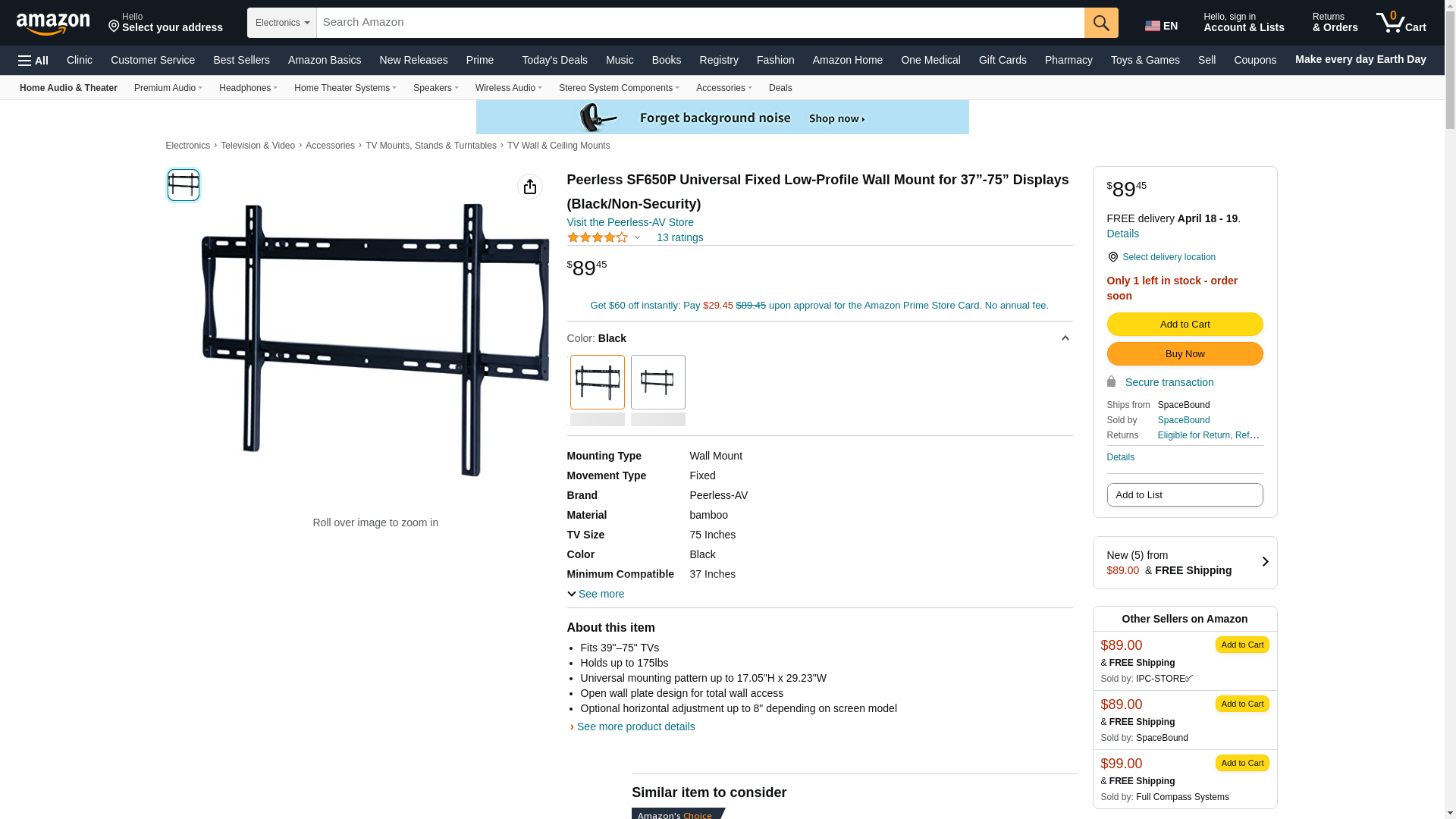 Peerless SF650P Universal Fixed Low-Profile Wall Mount for 37”-75” Displays (Black/Non-Security)