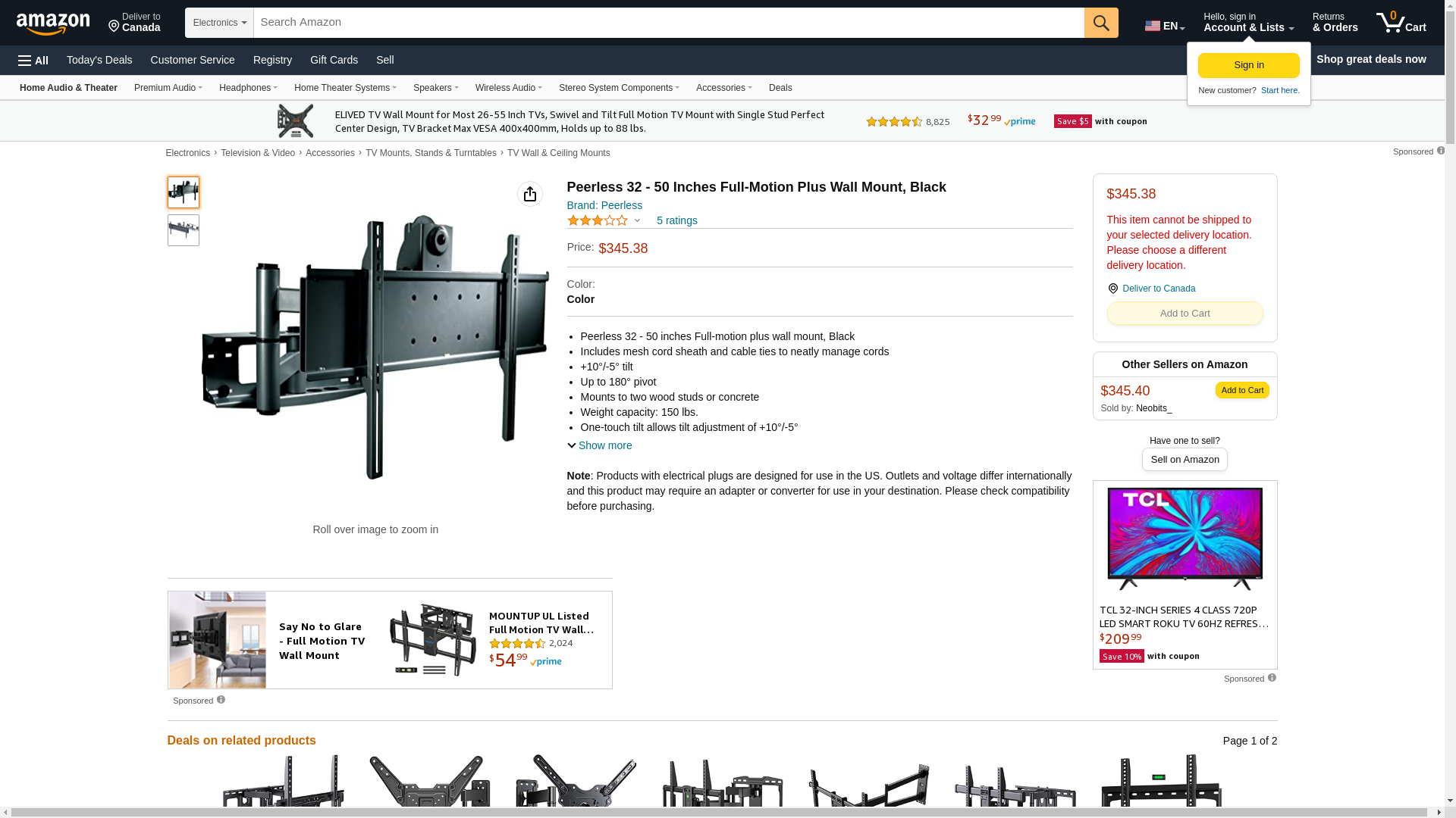 Peerless PLA50 Articulating Wall Arm for 32 to 65-Inch Flat Panel Screens Weighing Up to 150 lb. Screen-specific mode...