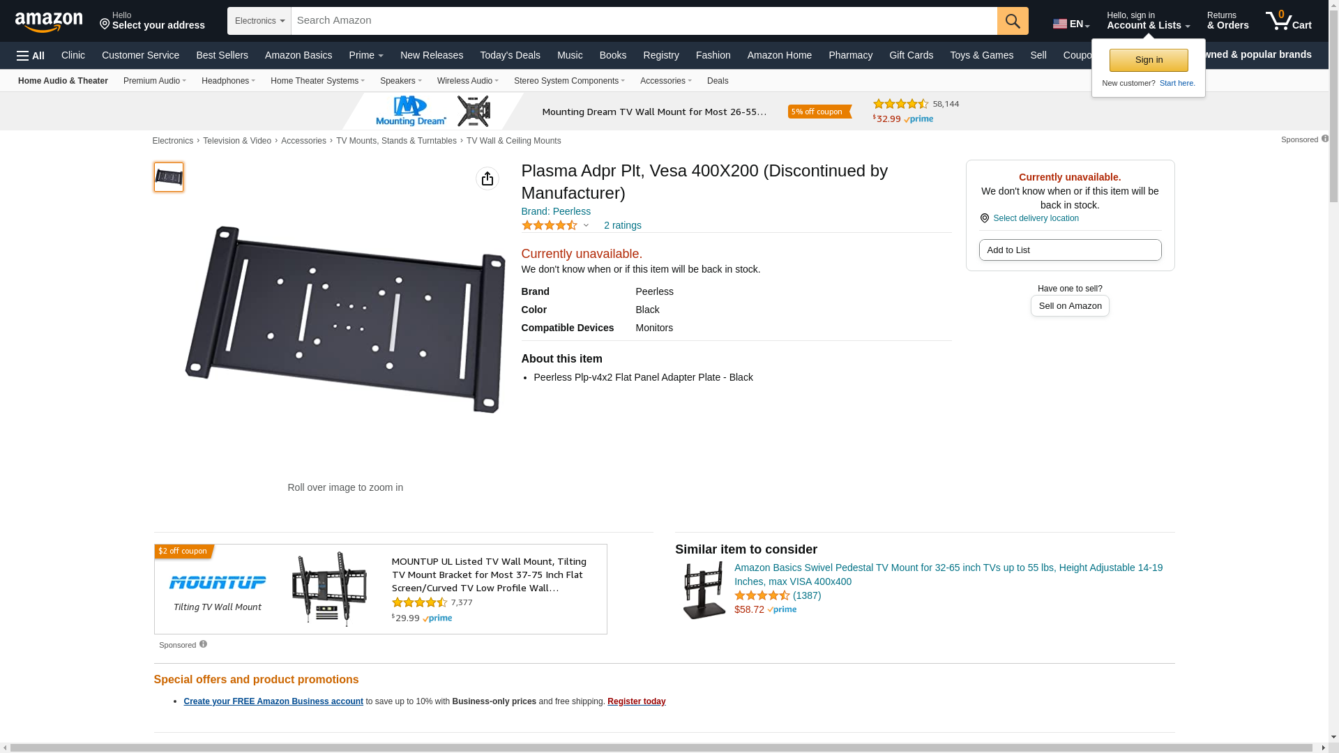 Plasma Adpr Plt, Vesa 400X200 (Discontinued by Manufacturer)