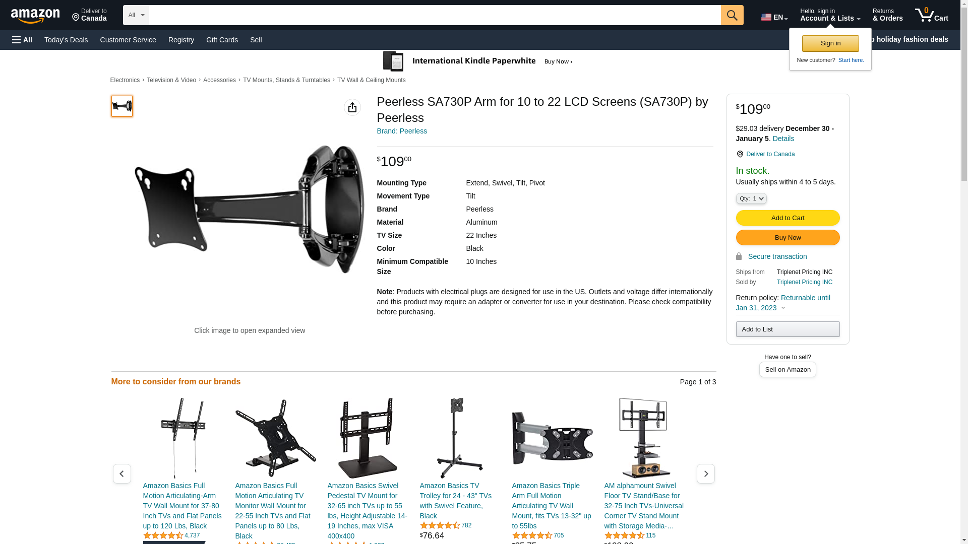 | Feature | Peerless Industries PEERLESS articulating LCD wall arm for 10"-22" flat panel screen (black) SA730P |