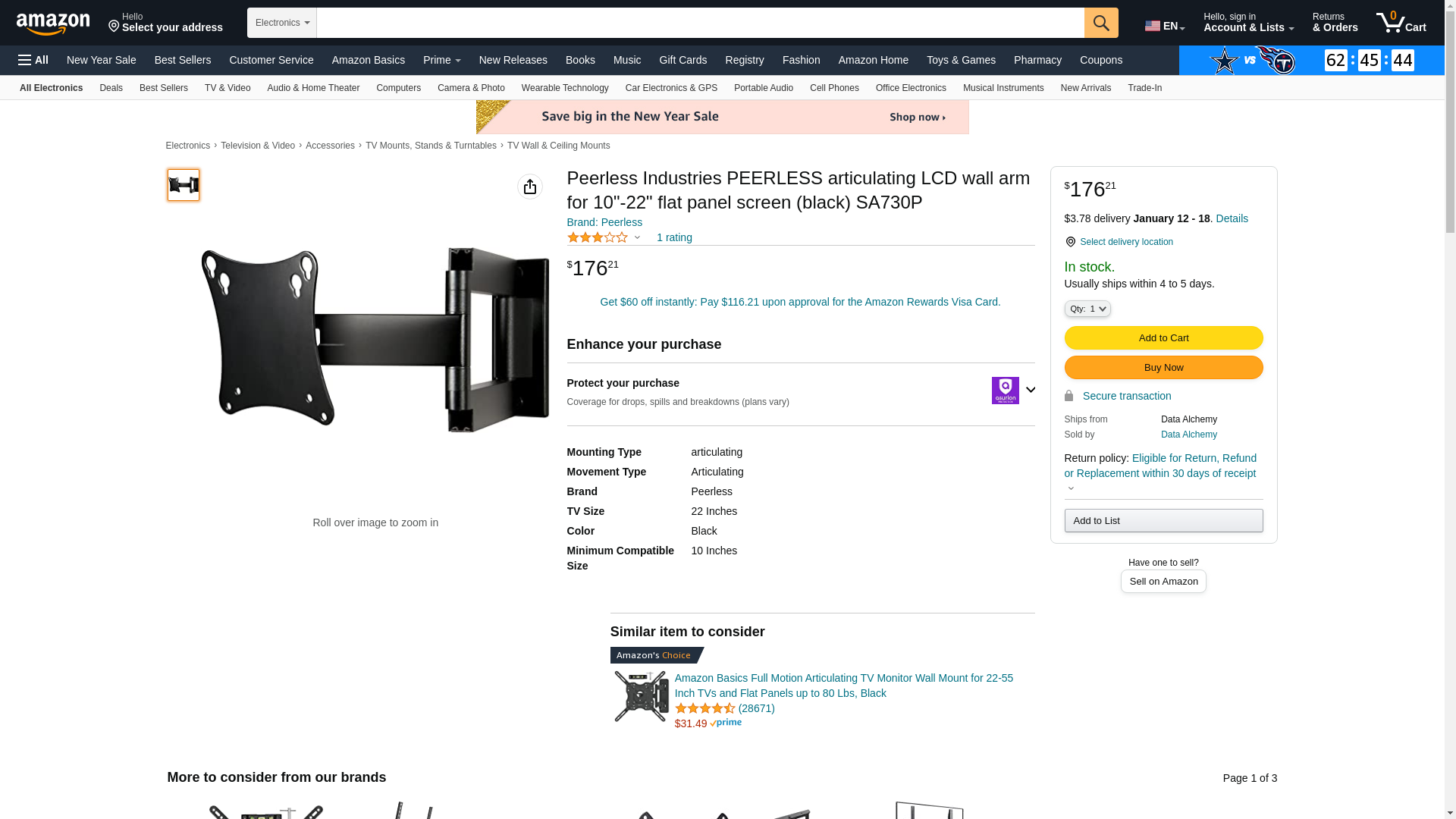 Peerless Smartmount Adjustable Wall Arm Makes It Easy To View The Display From Any Angle Two-Link Arm Extends Up To 16 From The Wall And Provides Easy One-Touch Tilt And 180 Degrees Of Swivel Fits 10 to 22 LCD screens Pre-assembled for fast and easy installation Comes with VESA 75 100 screen adapter plate Three tensionable pivot points for virtually limitless adjustments + or -35 degree of tilt and+ or - 7 degree of roll for flexible viewing positions Offers up to 180 degree of swivel Anodized aluminum finish in black or silver Built-in internal cord management channels keep wires out of the way Includes hardware for installation to a single wood stud or concrete Non-VESA adapter plates available sold separatelyPlease note: This supplier will be closed on 11/24, 12/26, 1/2 for the holidays. The shipping cut off is UPS's cut off of 12/15 to try and have the products delivered by Christmas.