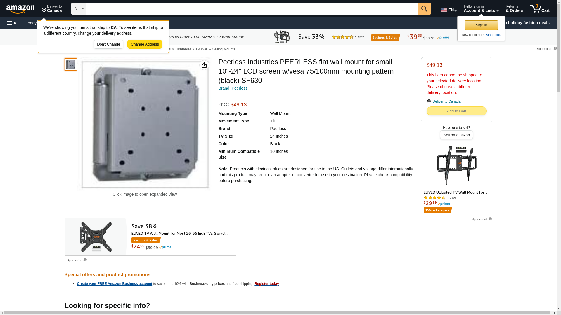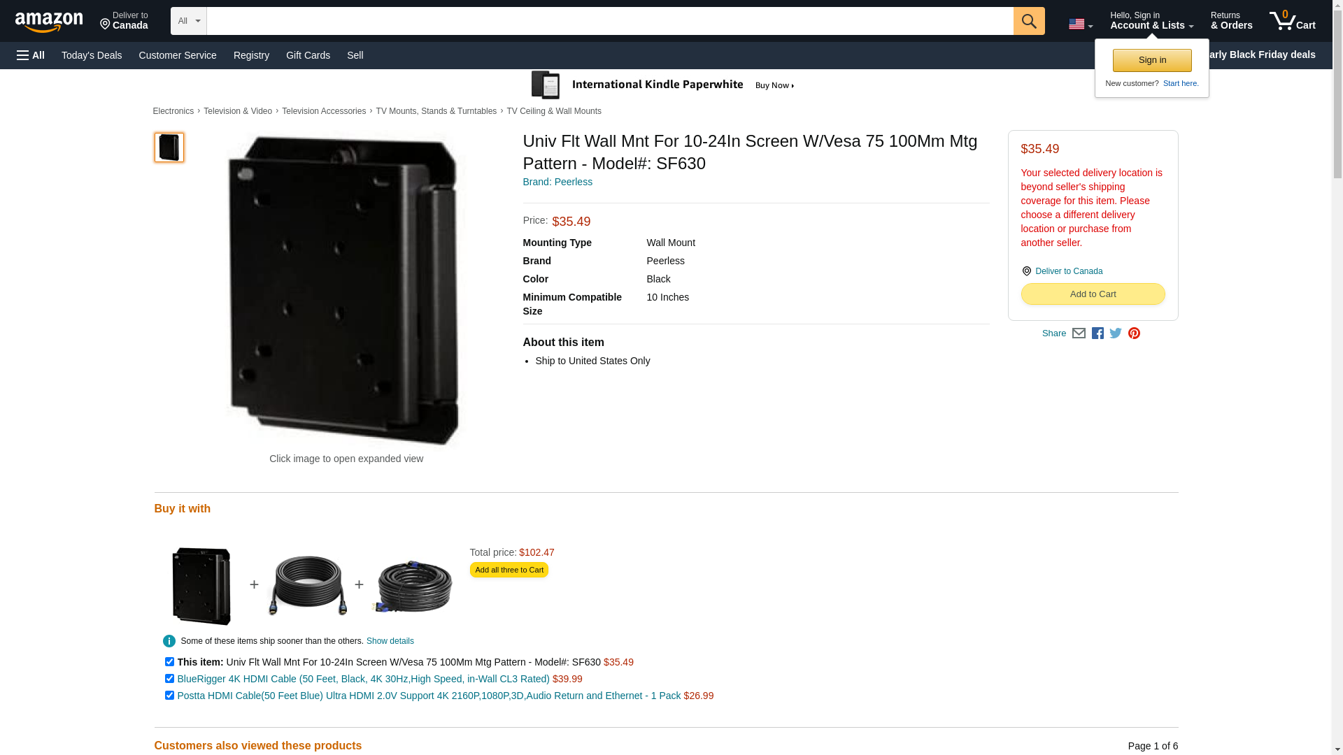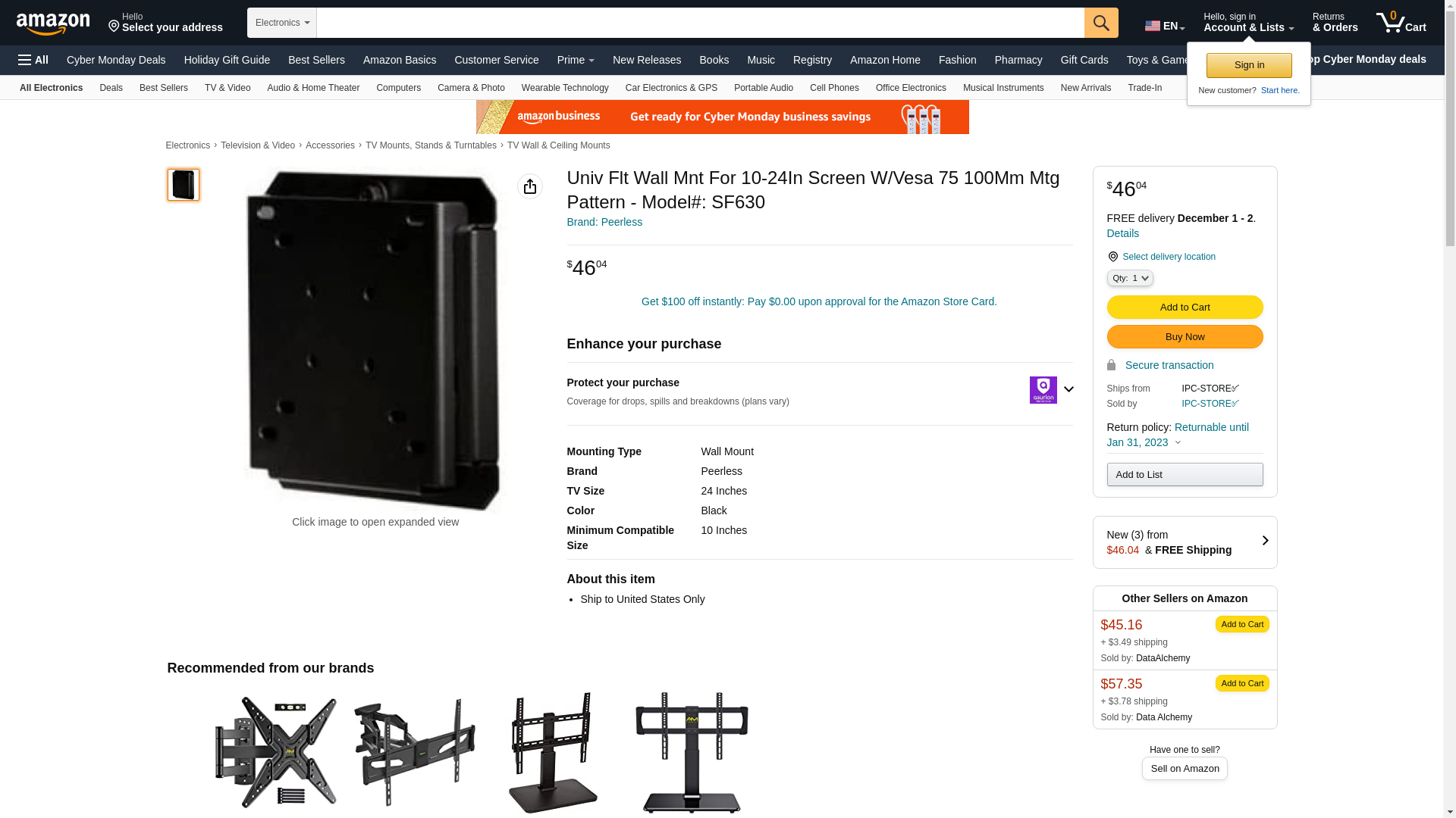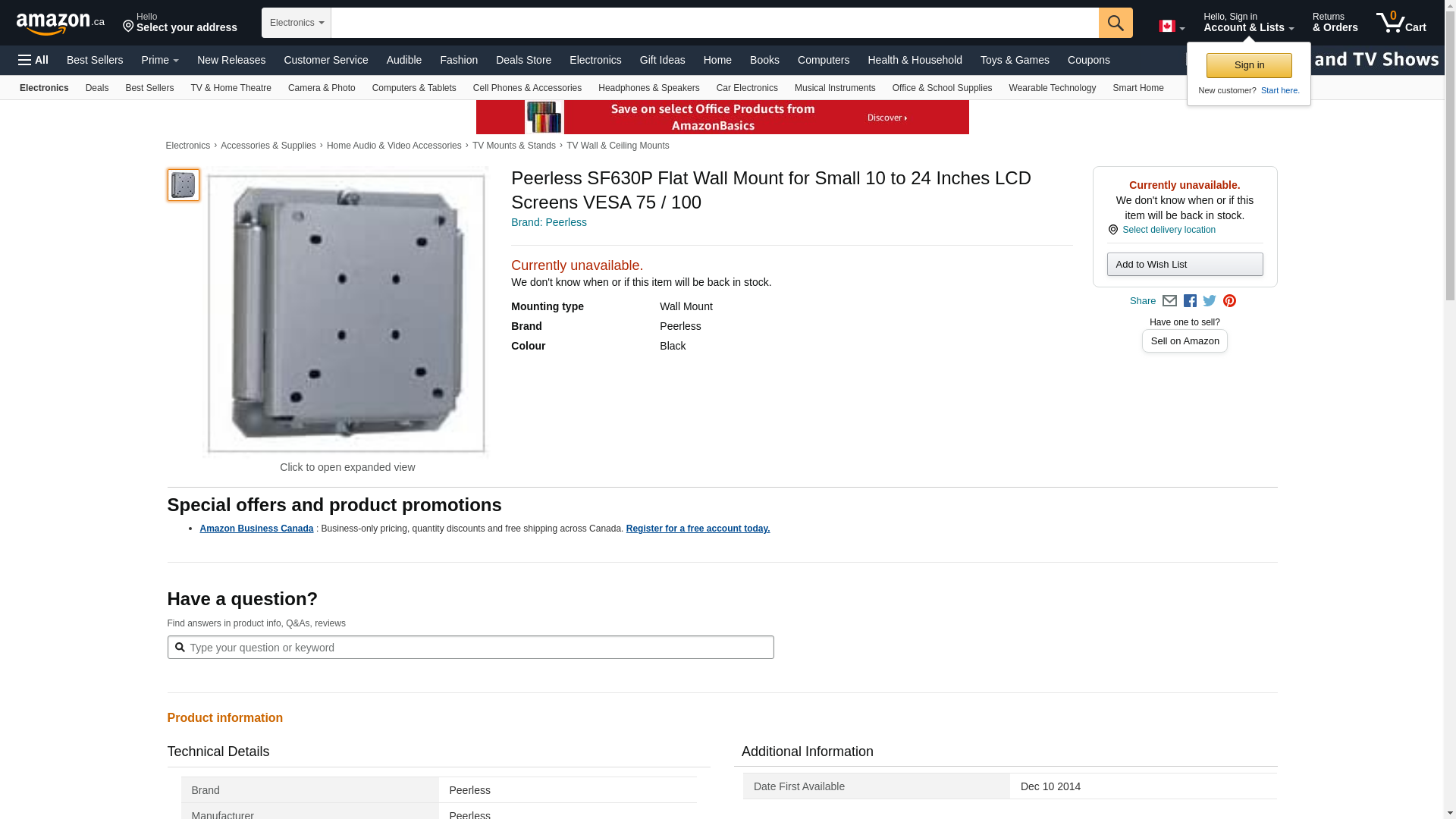 | Feature | Peerless Industries PEERLESS flat wall mount for small 10"-24" LCD screen w/vesa 75/100mm mounting pattern (black) SF630 |