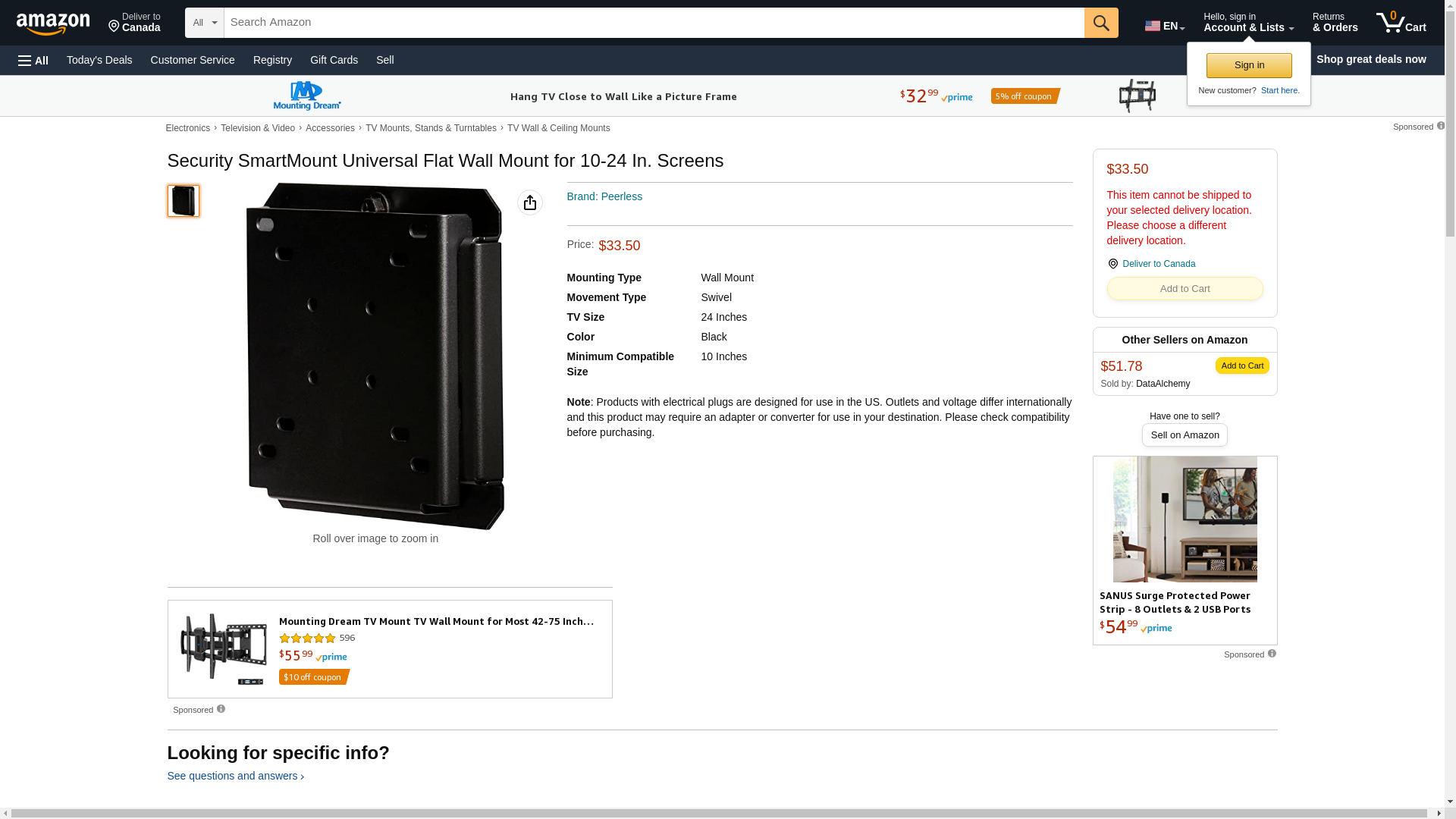Peerless SmartMount Universal Flat Mount 10"- 24" Screens