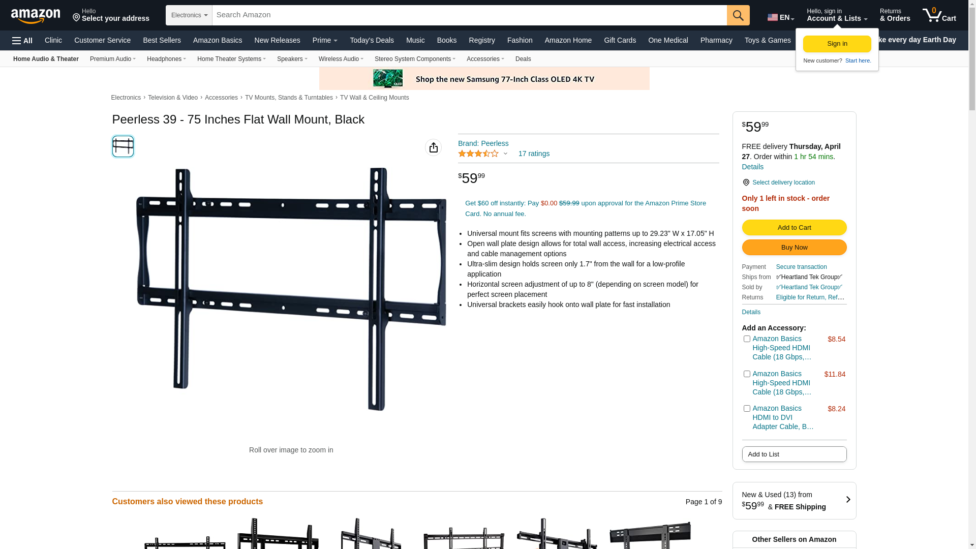 Peerless 39 - 75 Inches Flat Wall Mount, Black. Universal mount fits screens with mounting patterns up to 29.23" W x ...