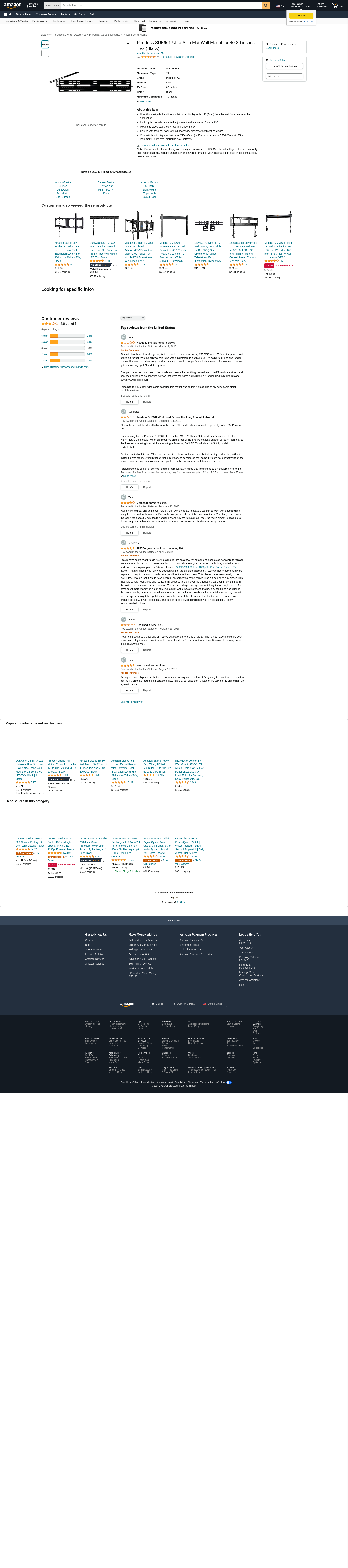 Peerless SUF661 Ultra Slim Flat Wall Mount for 40-80 inches TVs (Black). Ultra-thin design holds ultra-thin flat pane...