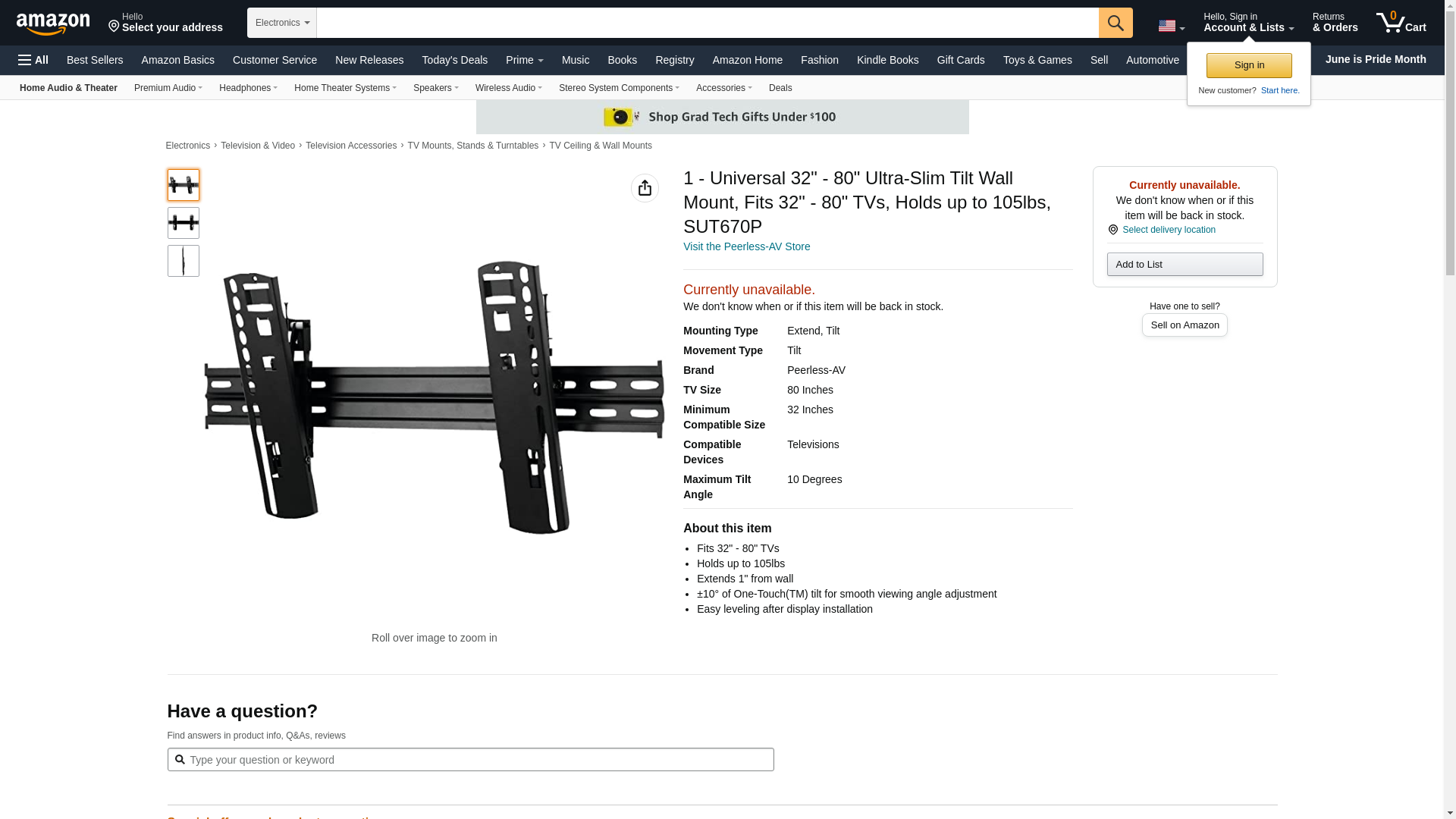 - PEERLESS-AV SUT670P Universal 32" - 80" Ultraslim Tilt Wall Mount