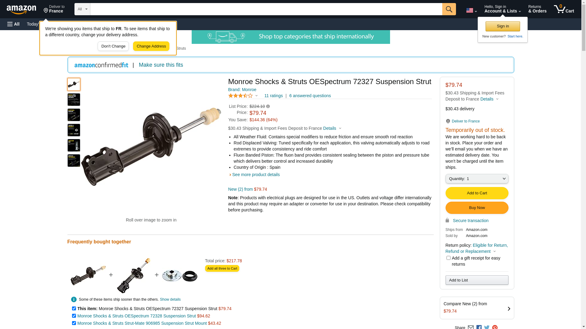 Monroe OESpectrum struts are engineered specifically for foreign nameplate vehicles and feature the latest global original equipment valving technologies. Developed through years of research and on-vehicle testing, Monroe OESpectrum units provide an unprecedented level of handling precision and control while filtering out the ride harshness commonly encountered on many foreign nameplate applications. This unique blend of control and comfort is made possible through Tenneco's 'Twin Technology Active Control System', an exclusive internal ding control technology first developed for leading global vehicle manufacturers. Tenneco's Twin Technology consists of its latest Impact Control Valve (ICV), which delivers exceptional control under virtually all driving conditions, and a patented Low Speed Tunability (LST) piston design that isolates impact-related noise, vibration and harshness. Features: <li>All Weather Fluid: Contains special modifiers to reduce friction and ensure smooth rod reaction</li><li>Rod Displaced Valving: Tuned specifically for each application, this valving automatically adjusts to road extremes to provide consistency and ride comfort</li><li>Fluon Banded Piston: The fluon band provides consistent sealing between the piston and pressure tube which delivers better control and increased durability</li> Product Details: <li> Weight: 10.2 pounds</li><li>Brand: Monroe</li><li>Item Weight: 2.2 pounds</li><li>Product Dimensions: 25.4 x 7.3 x 7.3 inches</li><li>Item model number: 72327</li><li>Manufacturer Part Number: 72327</li><li> Handling We will ship all orders within 3 business day of payment. </li><li> We Do Not Ship Outside of the Continental US. </li><li> Return Policy All items qualify for returns within 30 days of receipt. Buyer is responsible for return shipping on any item that is not damaged. </li><li> Feedback We take our reputation seriously, we buy and sell online, so we understand t