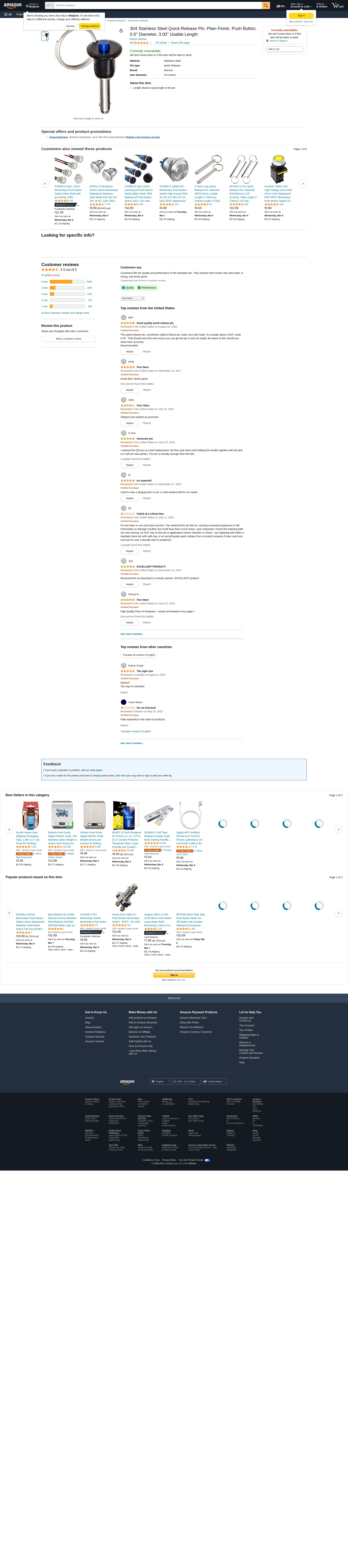 304 Stainless Steel Quick-Release Pin, Plain Finish, Push Button, 0.5" Diameter, 3.00" Usable Length. Length shown is...