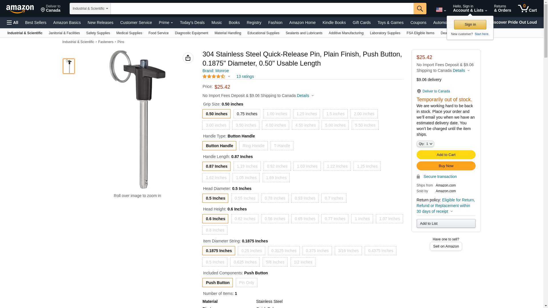304 Stainless Steel Quick-Release Pin, Plain Finish, Push Button, 0.1875" Diameter, 1.00" Usable Length. Length shown...