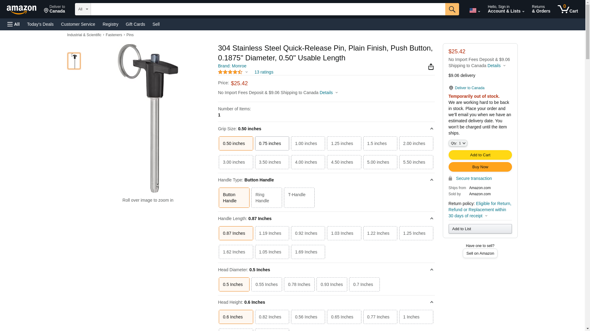 304 Stainless Steel Quick-Release Pin, Plain Finish, Push Button, 0.25" Diameter, 1.5" Usable Length