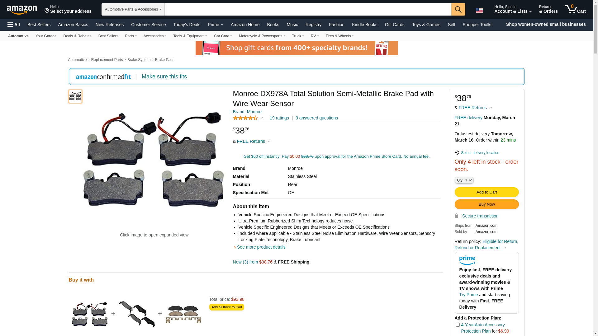 Monroe DX978A Total Solution Semi-Metallic Brake Pad with Wire Wear Sensor