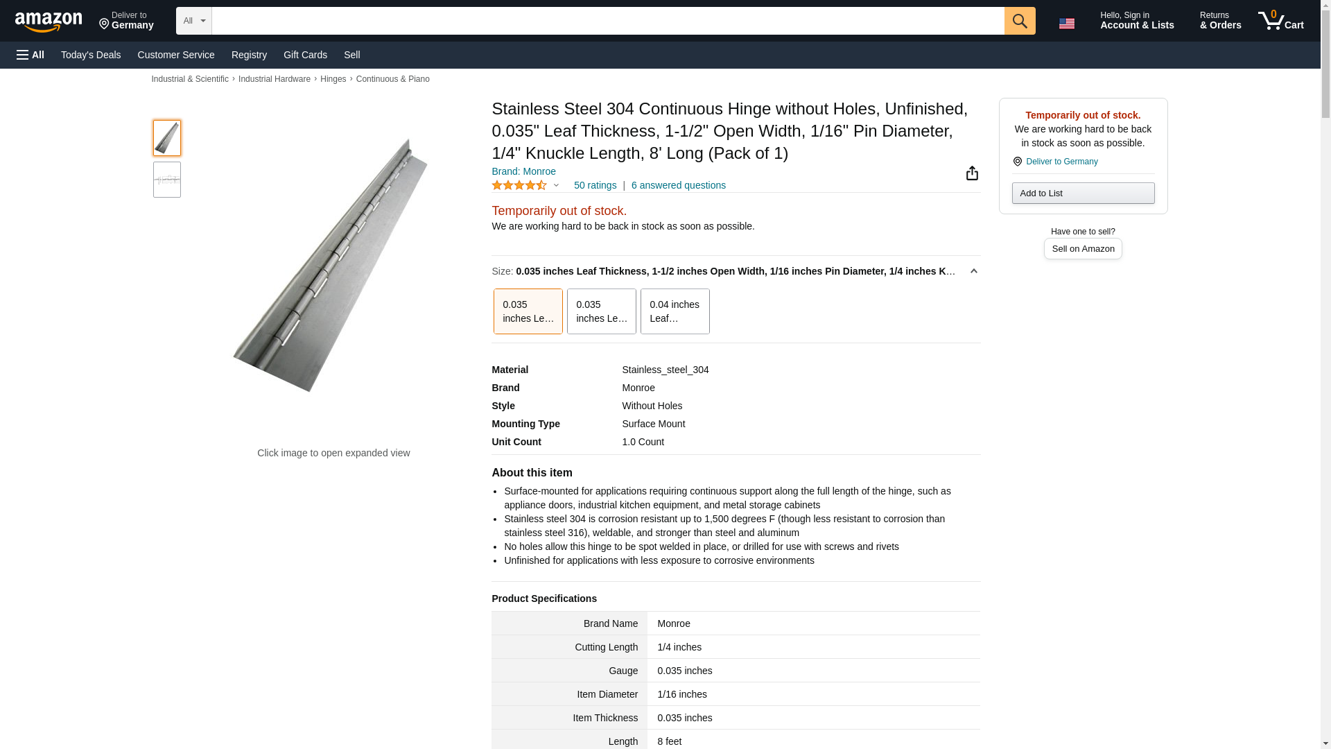 Stainless Steel 304 Continuous Hinge without Holes, Unfinished, 0.04" Leaf Thickness, 1-1/2" Open Width, 5/64" Pin Diameter, 1/2" Knuckle Length, 3' Long (Pack of 1)