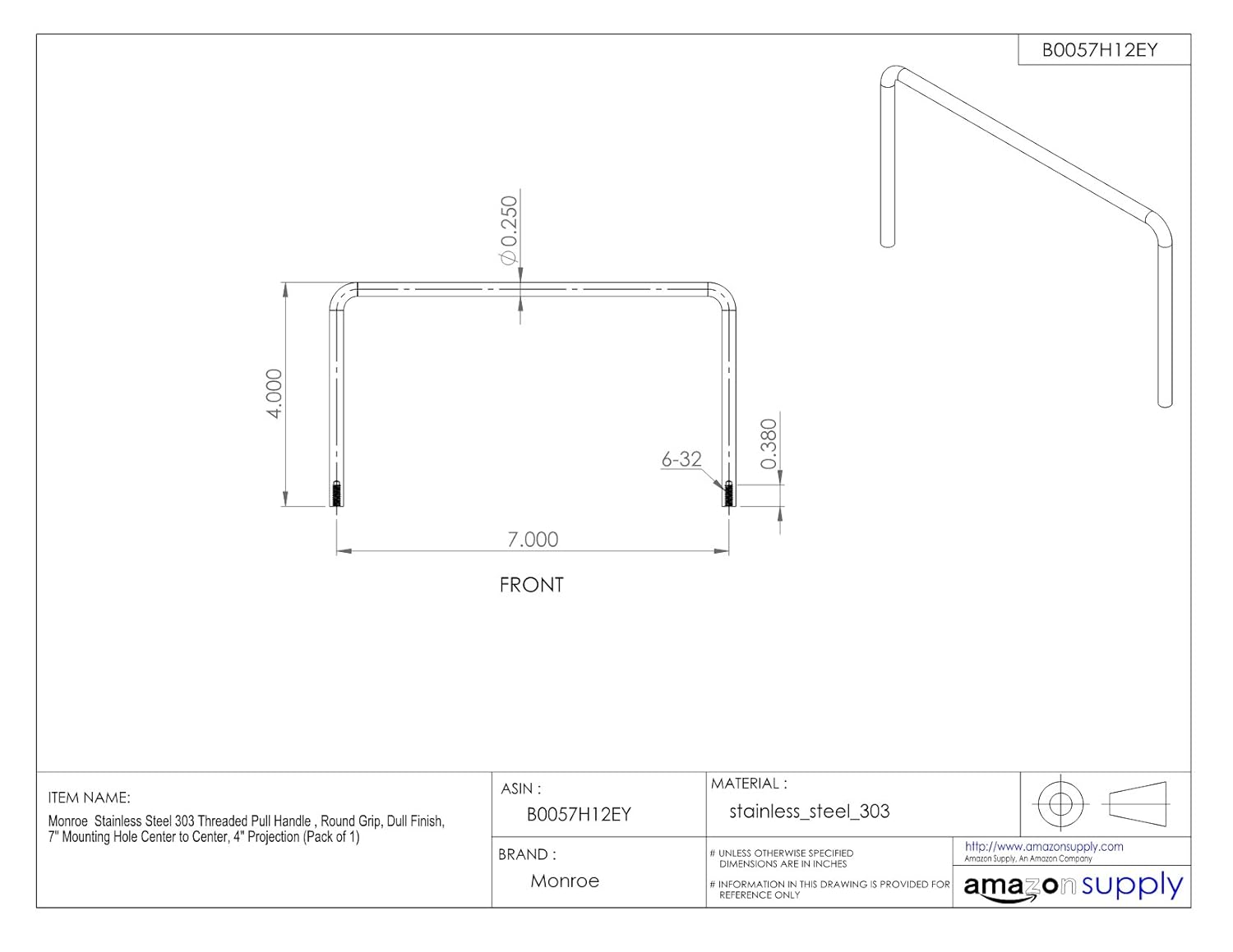 - Price For: Each Load Rated (Y/N): N Item: Pull Handle Mounting Type: Threaded Holes Material: 303 Stainless Steel Color: Natural Finish: Natural Thread Depth: 3/8" Projection: 4" Hardware: Included Screw Size: 6-32 Grip Dia.: 1/4" Mounting Hole Center to Center: 7" Country of Origin (subject to change): China