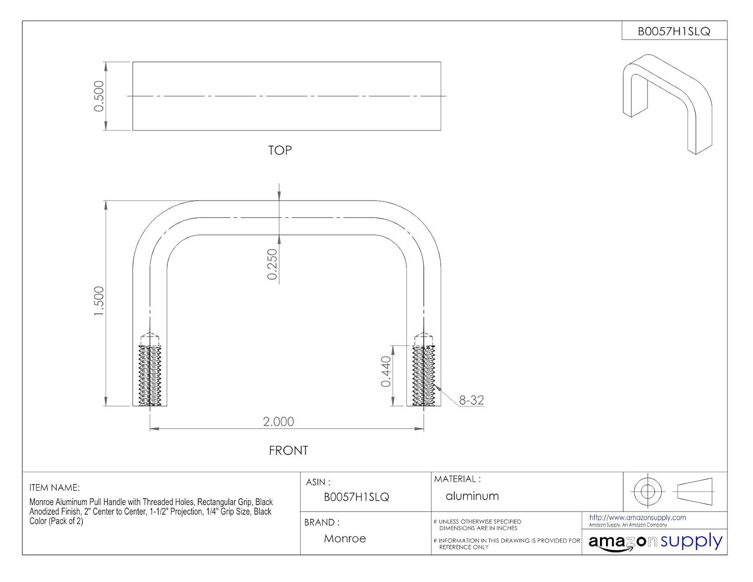 Monroe Aluminum Pull Handle with Threaded Holes, Rectangular Grip, Black Anodized Finish, 2" Center to Center, 1-1/2" Projection, 1/4" Grip Size, Black Color (Pack of 2)