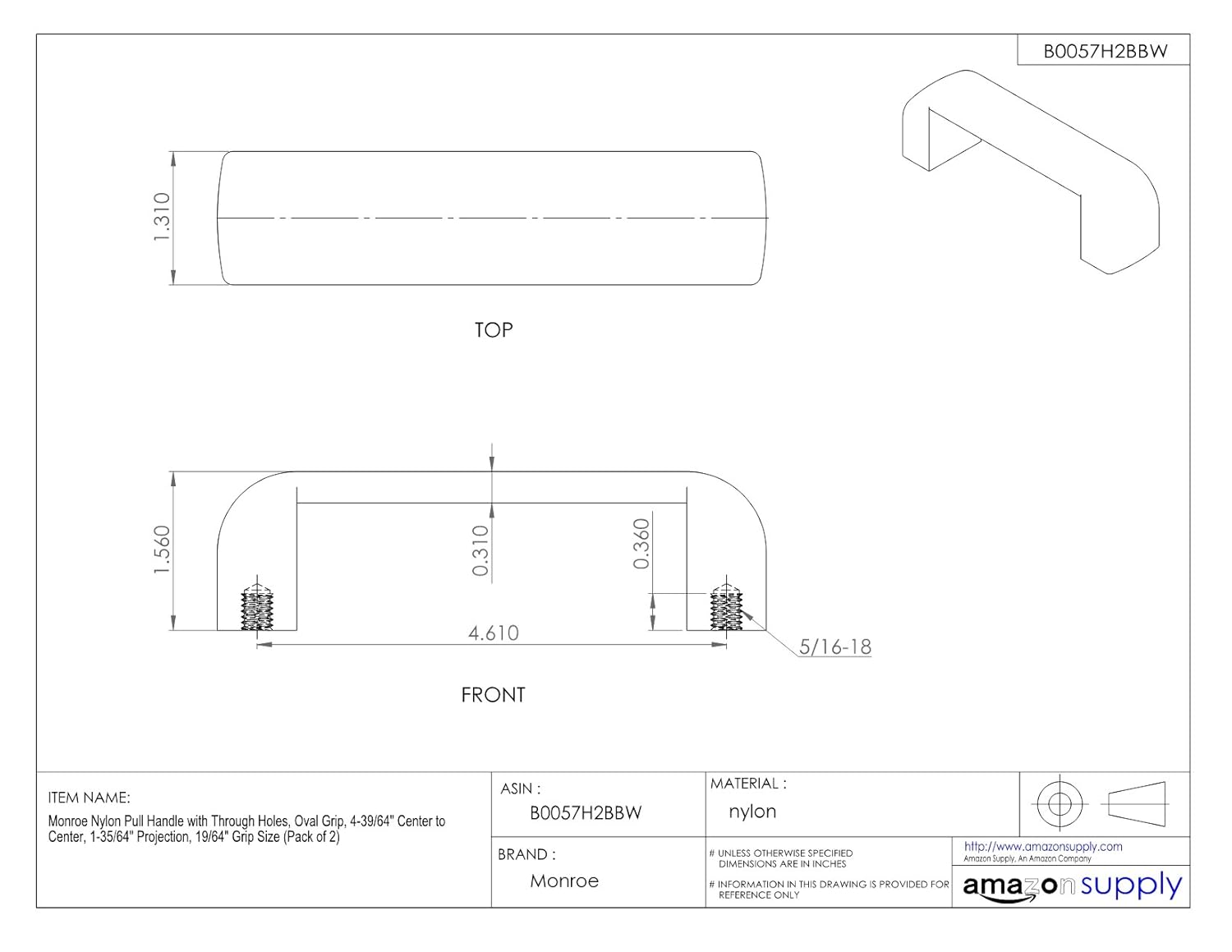 Monroe PMP PH-0195 4-39/64" Mounting Hole Center to Center, 1-9/16" Projection, Oval Grip with Threaded Holes, Nylon Inch Plastic Load Rated Pull Handle