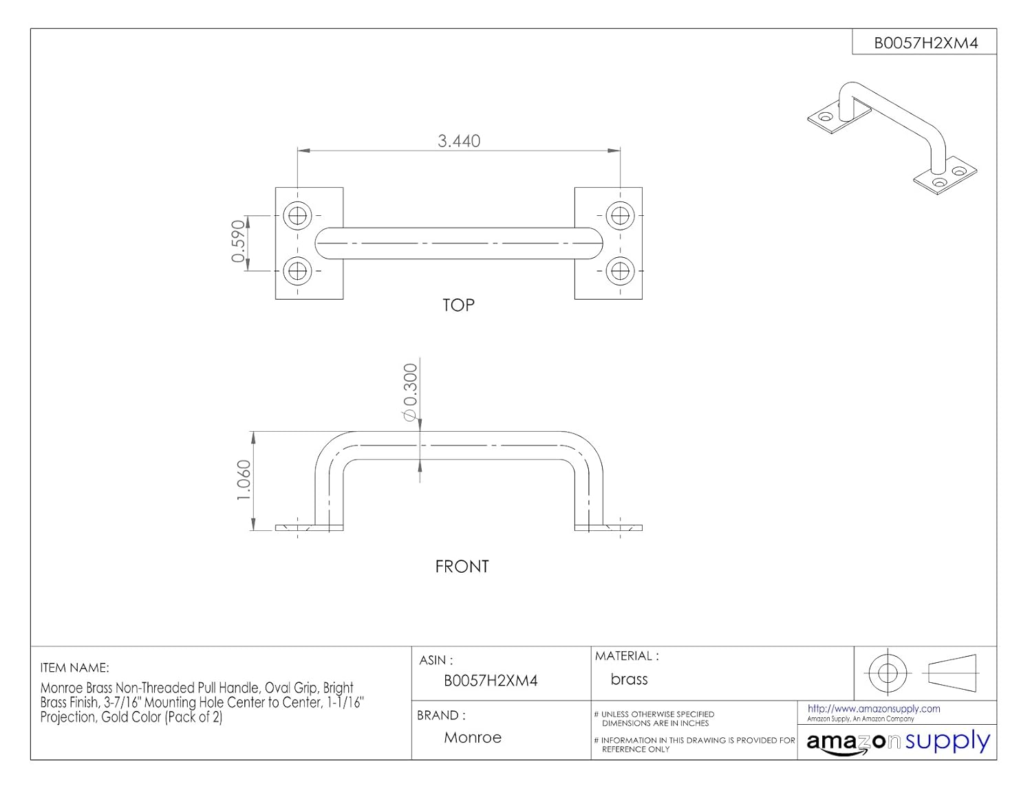 Monroe Brass Non-Threaded Pull Handle, Oval Grip, Bright Brass Finish, 3-7/16" Mounting Hole Center to Center, 1-1/16" Projection, Gold Color (Pack of 2)