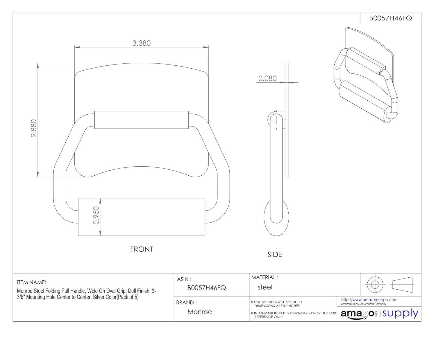 Monroe Steel Folding Pull Handle, Weld On Oval Grip, Dull Finish, 3-3/8" Mounting Hole Center to Center, Silver Color...