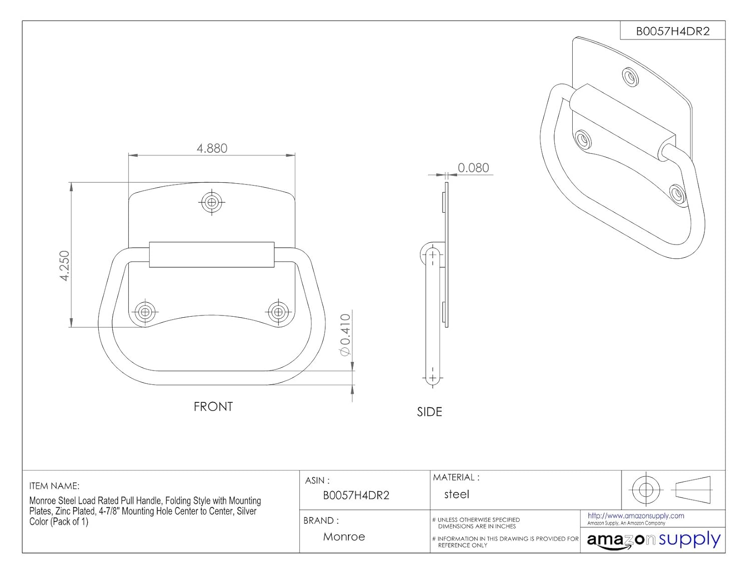 Monroe Steel Load Rated Pull Handle, Folding Style with Mounting Plates, Zinc Plated, 4-7/8" Mounting Hole Center to Center, Silver Color (Pack of 1)