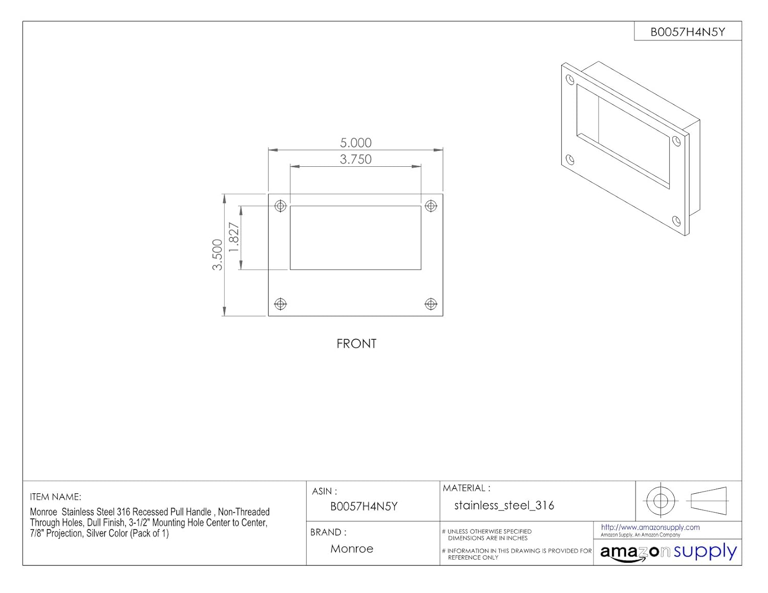 Monroe Stainless Steel 316 Recessed Pull Handle , Non-Threaded Through Holes, Dull Finish, 3-1/2" Mounting Hole Center to Center, 7/8" Projection, Silver Color (Pack of 1)
