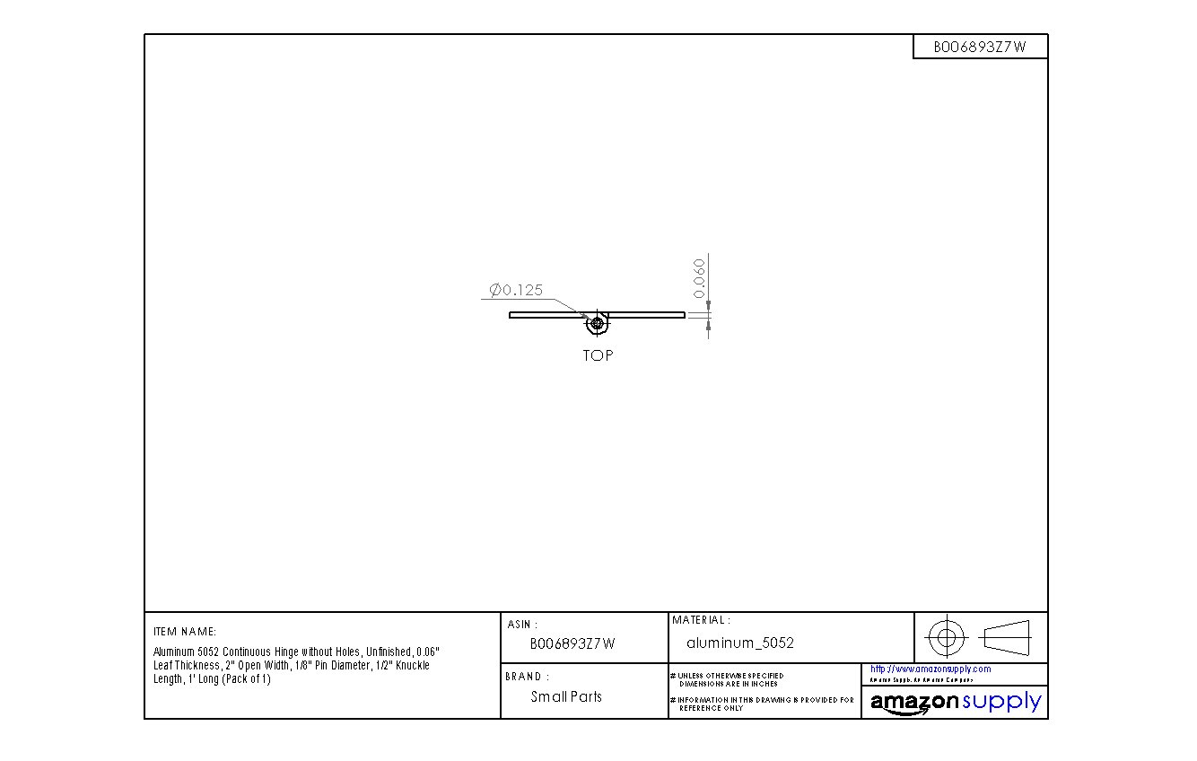 The aluminum 5052 continuous hinge has no holes and is suitable for surface-mounted applications requiring uninterrupted support along the full length of the pieces being joined. This hinge is suitable for hollow metal doors and frames, and for use with wood and aluminum. Aluminum 5052 is weldable, stronger than aluminum 3003, and more corrosion resistant than steel and aluminum 3003. However, aluminum 5052 does not provide the same strength as steel and stainless steel. This hinge can be customized for various surface-mounting needs because it does not have pre-drilled holes; it must be spot welded in place, or drilled for use with screws and rivets. Since the hinge is unfinished, it is suited for applications that will not be exposed to corrosive environments. The range of motion for this hinge is 270 degrees from the folded position. </p> <p> Continuous hinges, also called piano hinges, provide support to run the full length of the doors, panels, or pieces being joined together. They are manufactured in a variety of materials and sizes, with or without holes, finished or unfinished, and can be cut to specific sizes. They also vary by knuckle length, pin diameter, leaf thickness, and open width. The knuckle is the tubular part of the hinge through which the pin passes, and knuckle length is the measurement of an individual section. The pin runs the length of the hinge holding the leaves together. The leaf is the flat metal portion of the hinge that extends laterally from the knuckle and revolves around the pin. Open width is the dimension from the outer edge of one leaf to the outer edge of the other when the hinge is fully open.</p> </div>