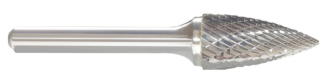 Carbide bur shape flame, cutter diameter- 5/8, shank size- 1/4, overall length-2-3/8, length of cut- 1-7/16, cutting edge type double cut shank material- steel trade number SH-6, application contouring and milling.