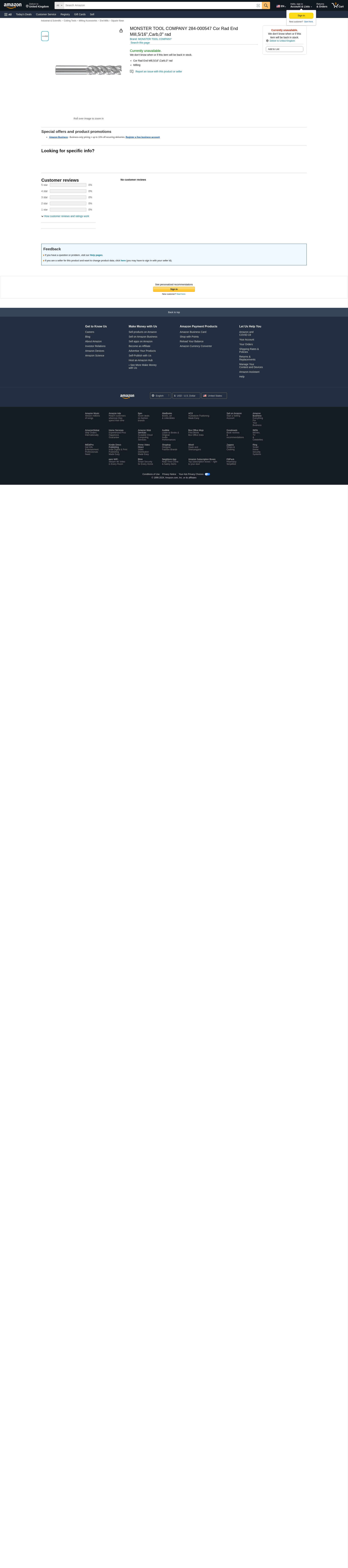 MONSTER TOOL COMPANY 284-000547 Cor Rad End Mill,5/16",Carb,0" rad
