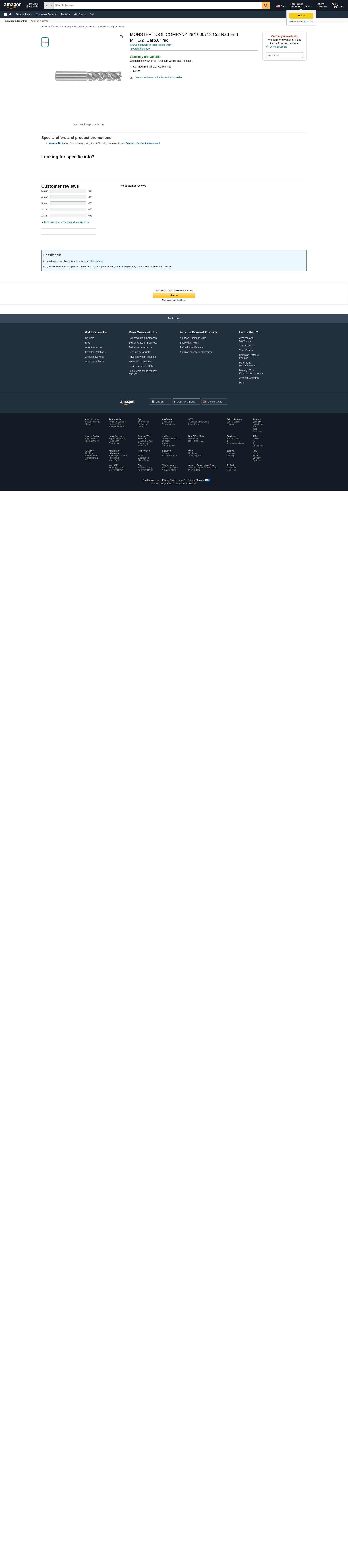MONSTER TOOL COMPANY 284-000713 Cor Rad End Mill,1/2",Carb,0" rad