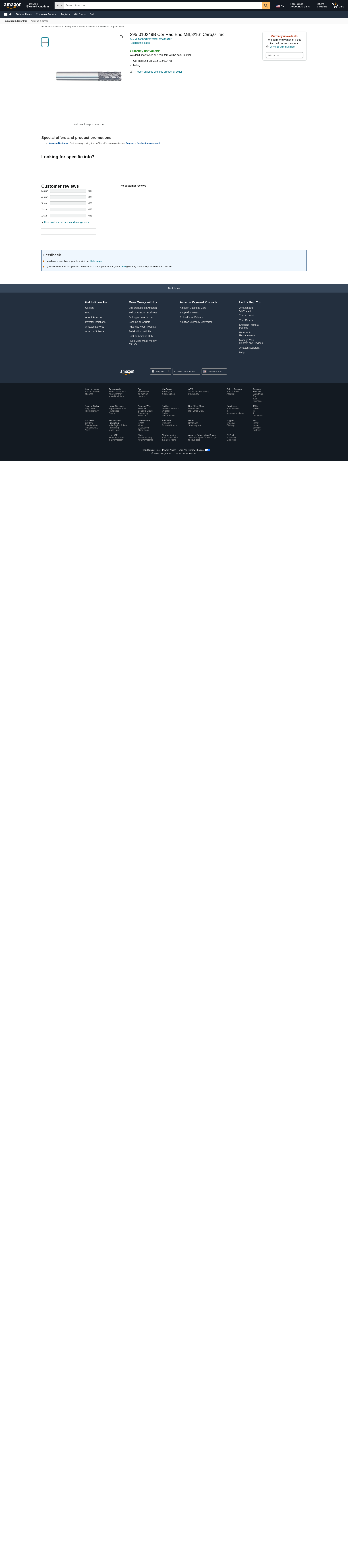 MONSTER TOOL COMPANY 295-010249B Cor Rad End Mill,3/16",Carb,0" rad