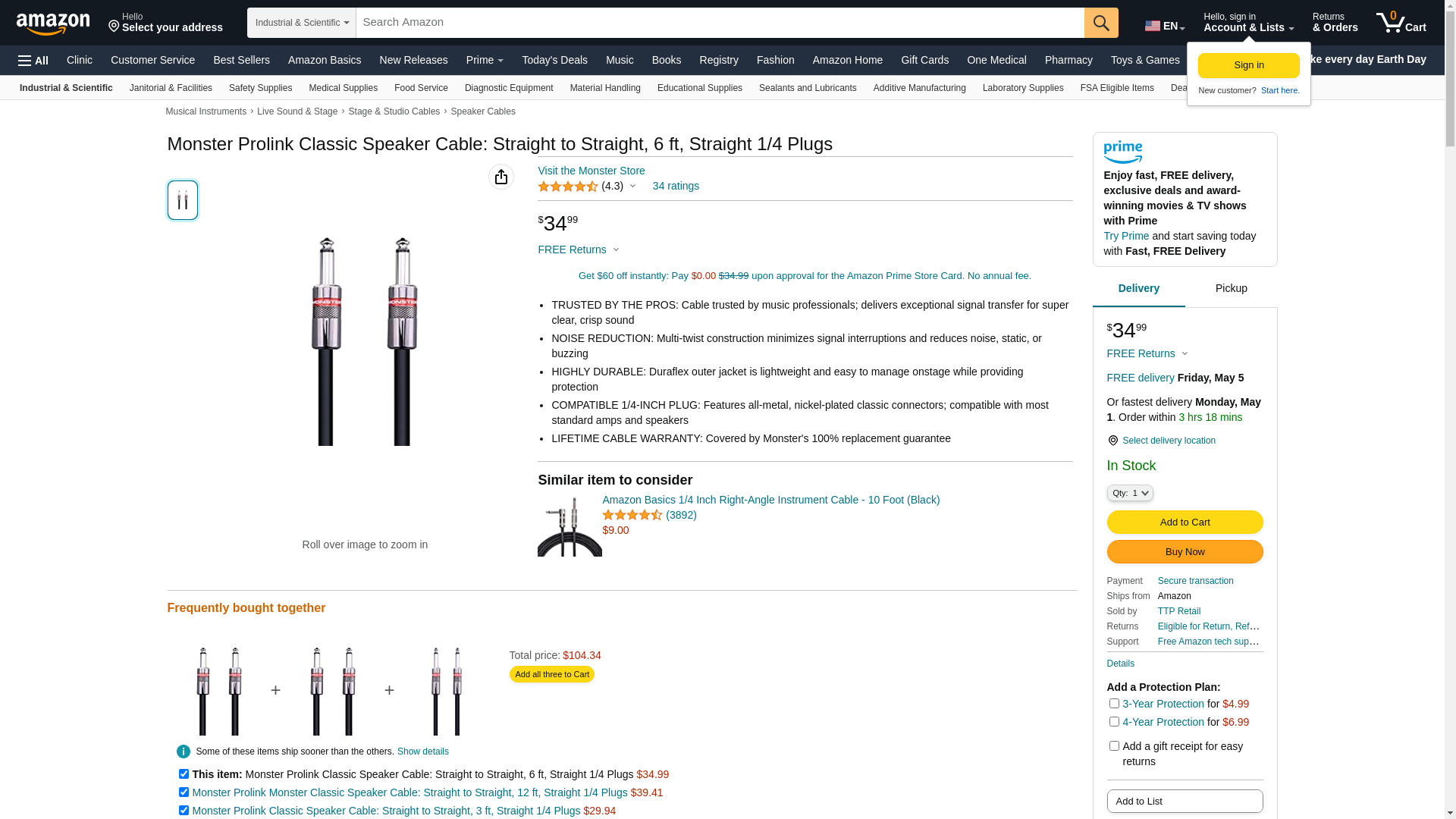 Monster Prolink Classic Speaker Cable: Straight to Straight, 6 ft, Straight 1/4 Plugs