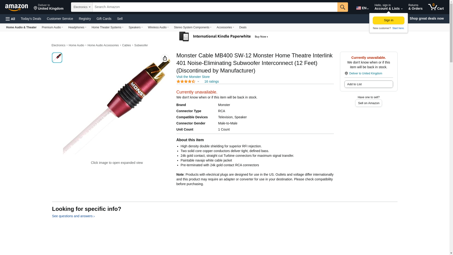 Monster Cable MB400 SW-12 Monster Home Theatre Interlink 401 Noise-Eliminating Subwoofer Interconnect (12 Feet) (Discontinued by Manufacturer)