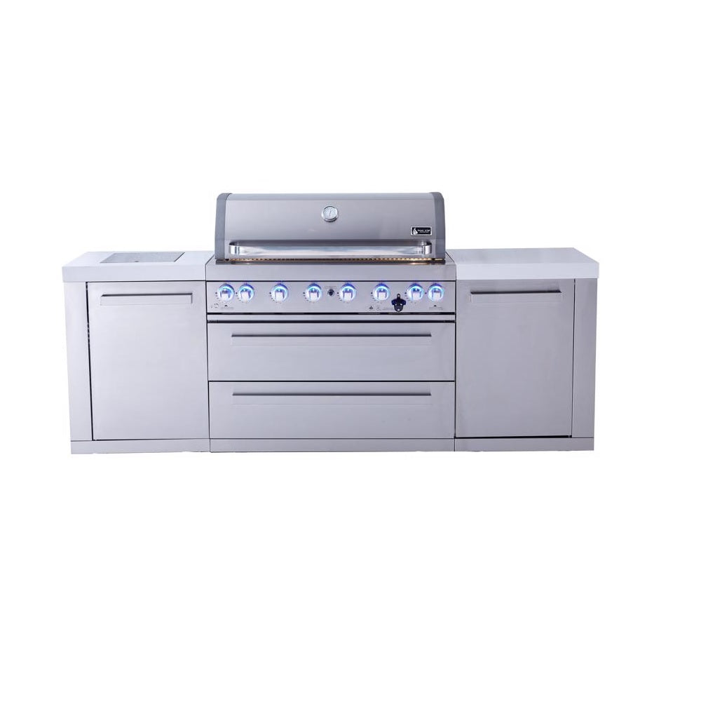 - ISLAND FEATURES - The MAi805 44-inch island gas grill arrives fully assembled (modular assembly required) and features 6 tubular stainless steel high efficiency burners with a rear height-adjustable ceramic infrared rear burner and a standalone side burner that produce a whopping 115,000 BTU’s of heat output. The grill also features a stainless steel warming rack, 8mm stainless steel cooking grids and a generous cooking area of 38-inches x 18-inches (990 square Inches of total cooking area)