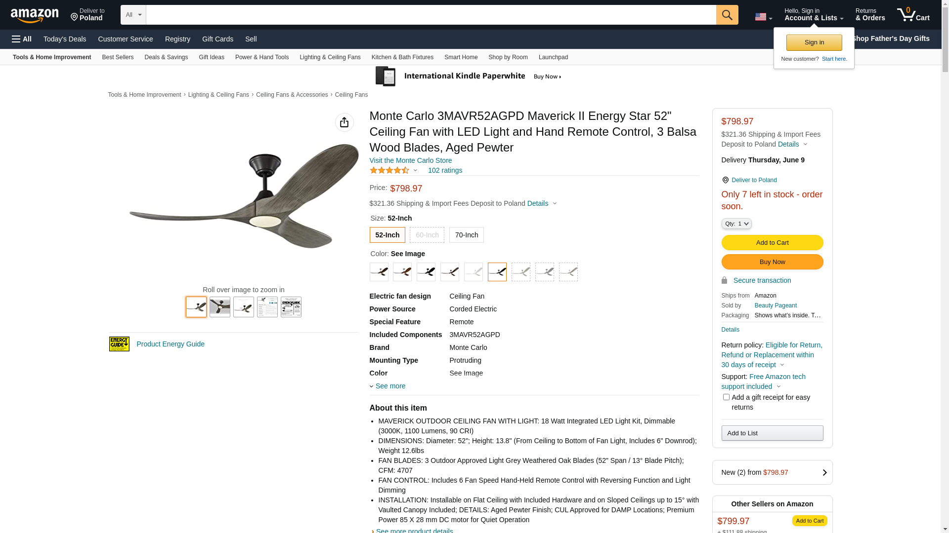 Monte Carlo 3MAVR52AGPD Maverick II Energy Star 52" Ceiling Fan with LED Light and Hand Remote Control, 3 Balsa Wood Blades, Aged Pewter