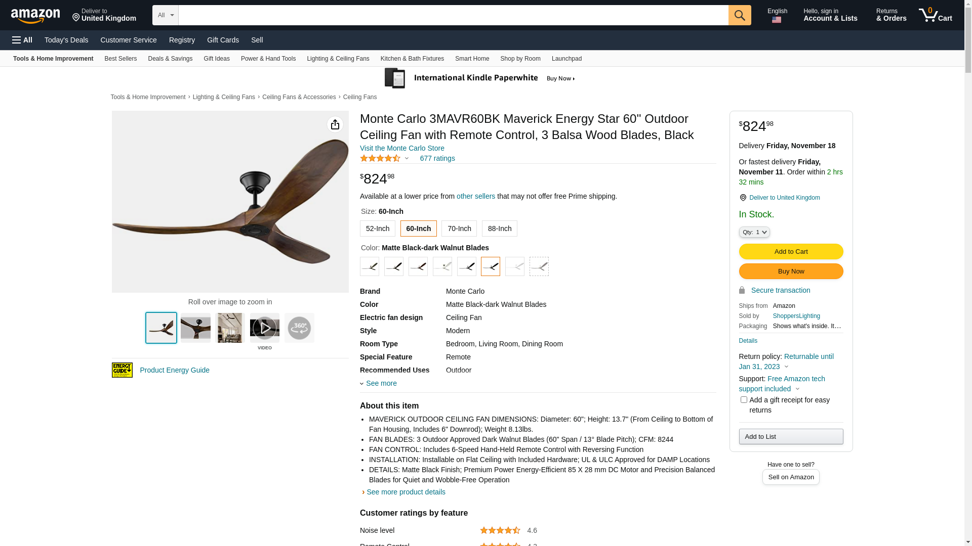- FAN BLADES: 3 Outdoor Approved Dark Walnut Blades (60" Span / 13° Blade Pitch); CFM: 8244