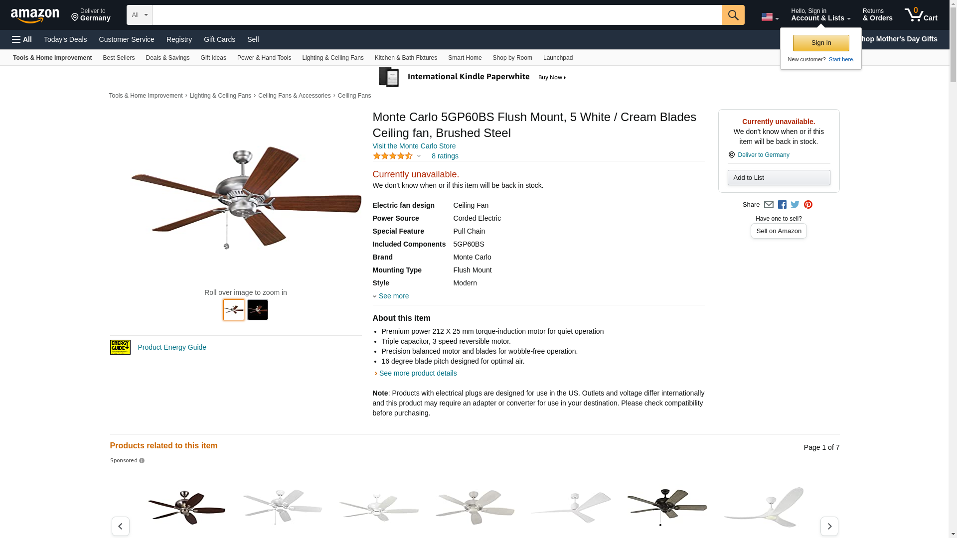 Monte Carlo 5GP60BS Flush Mount, 5 White / Cream Blades Ceiling fan, Brushed Steel