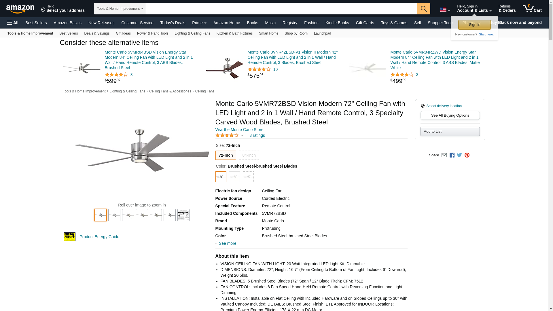 Monte Carlo 5VMR72BSD Vision Modern Large 72" Ceiling Fan with LED and Remote & Green Energy-efficient DC Motor, 5 Wood Blades, Brushed Steel