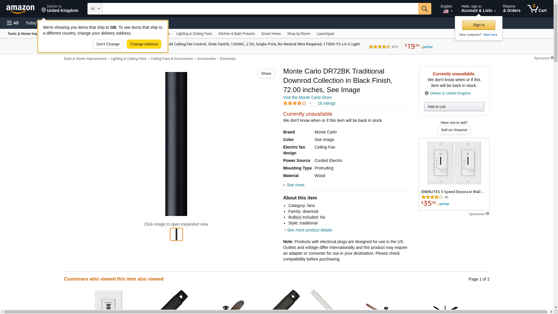 Monte Carlo DR72BK Traditional Downrod Collection in Black Finish, 72.00 inches, See Image