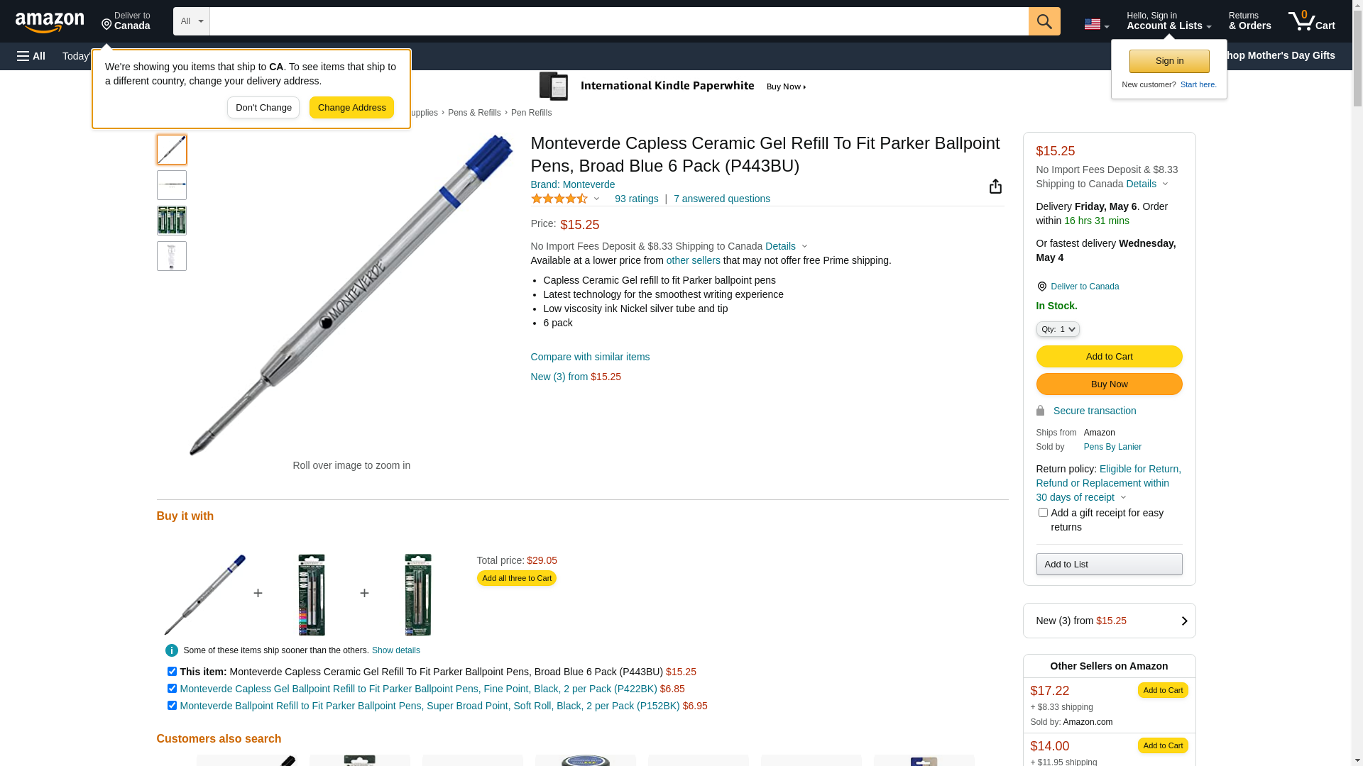 Monteverde Capless Ceramic Gel Refill To Fit Parker Ballpoint Pens, Broad Blue 6 Pack (P443BU)