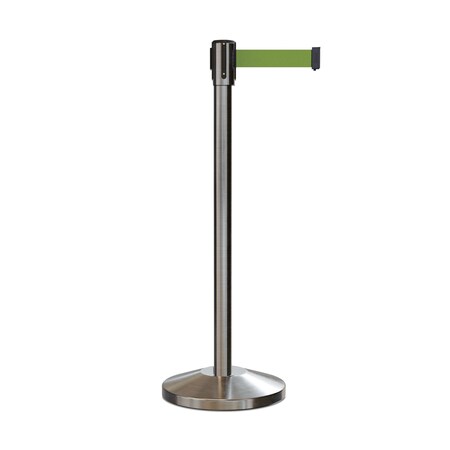 Retractable Belt Barrier Stanchion, 2" Sat.Steel Post 7.5'Olive Belt