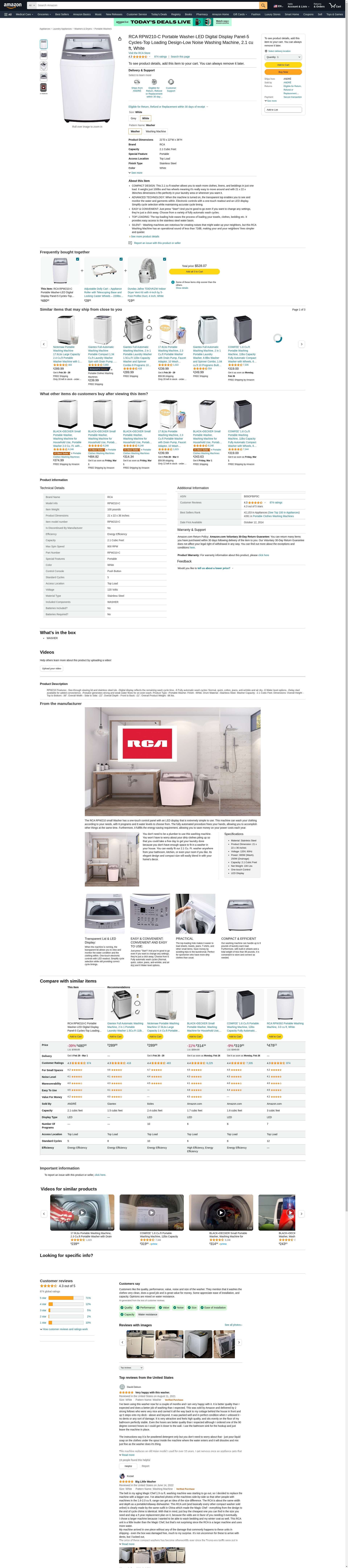 RCA RPW210-C Portable Washer-LED Digital Display Panel-5 Cycles-Top Loading Design-Low Noise Washing Machine, 2.1 cu ft, White