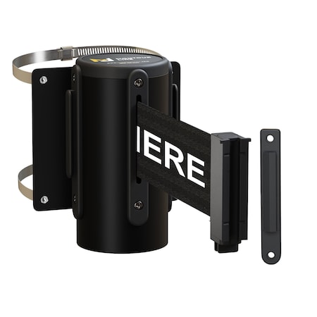 - Includes (1) Wall Mounted Retractable Belt Barrier with Recessed Mount, Black Casing and 8.5 ft Black with "PLEASE WAIT HERE" White Letters belt with Standard Belt End (1) Wall Receiver and Hardware