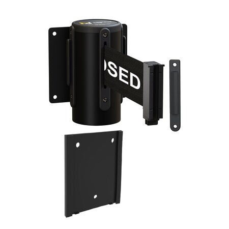 - Includes (1) Wall Mounted Retractable Belt Barrier with Removable Mount, Black Casing and 8.5 ft Black with "THIS LINE CLOSED" White Letters belt with Standard Belt End (1) Wall Receiver and Hardware
