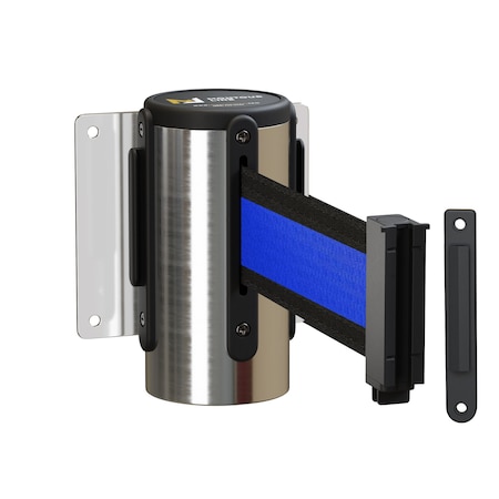 - Includes (1) Wall Mounted Retractable Belt Barrier with Fixed Mount, Polished Stainless Steel Casing and 11 ft Black with Horizontal Blue Stripe belt with Standard Belt End (1) Wall Receiver and Hardware