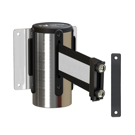 - Includes (1) Wall Mounted Retractable Belt Barrier with Fixed Mount, Polished Stainless Steel Casing and 8.5 ft Black with White Horizontal Stripe belt with Magnetic Belt End (1) Wall Receiver and Hardware